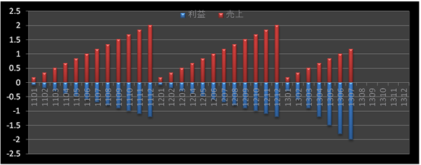 結果的に、一番右端のグラフの数値が全体の利益額になります。