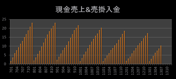 営業キャッシュフローは入金(売上等)と出金(仕入・販管費・税金等)の結果ですので、入金、出金を其々検討する必要があります。このグラフは入金サイドを年度(12ヵ月)サイクルで集計したグラフです。グラフBから、入金サイドを抜き出したグラフに相当します。このような検討は通常期中に行われますので、進行期は7ヵ月しかありませんが、これが自然な形です。また、現金売上と売掛入金を統合していますが、実際上は区分され、その他にも手形入金等がある場合は、それらを区分したグラフも利用します。